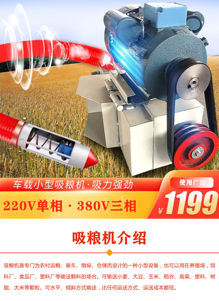 吸糧機(jī)是農(nóng)場吸糧、抽糧的好幫手,適合糧食運(yùn)輸、裝載、堆垛、儲(chǔ)存等,長度3-30米,每小時(shí)可輸送20噸糧食,它可以水平、傾斜或垂直輸送谷物。糧食垂直輸送時(shí),每小時(shí)輸送量可達(dá)6噸。